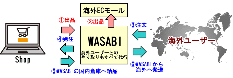 世界的に有名な大手モールの「WASABI運営アカウント」に相乗りして出品する手法です。